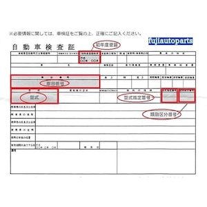 ⇒⇒ 車検証の初年度登録年月日/車体番号/型式/型式指定番号/類別区分番号をお知らせください。その後、当社からの回答を確認後、ご購入をお願いいたします。
