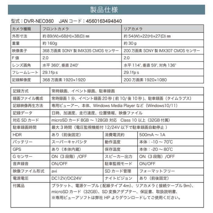 2カメラ ドライブレコーダー DVR-NEO360